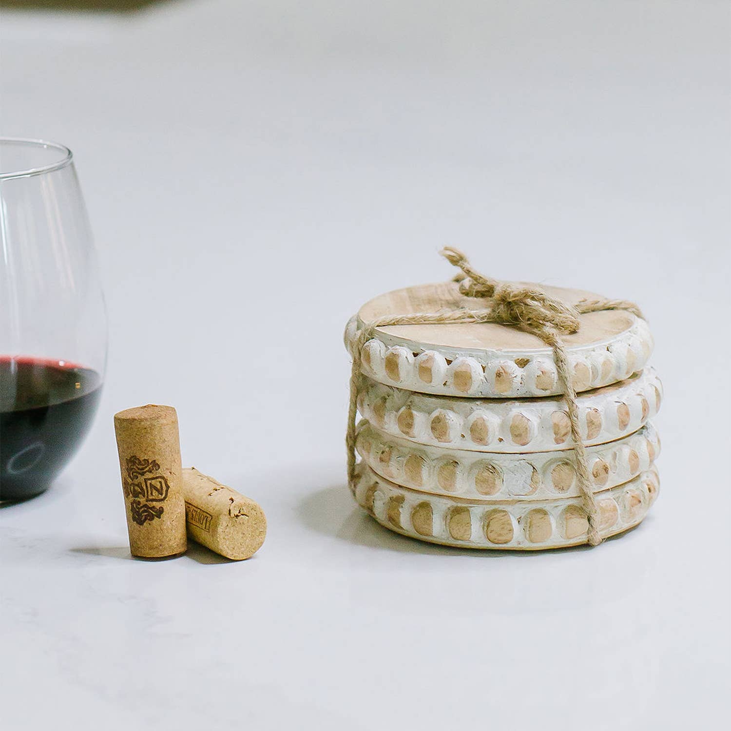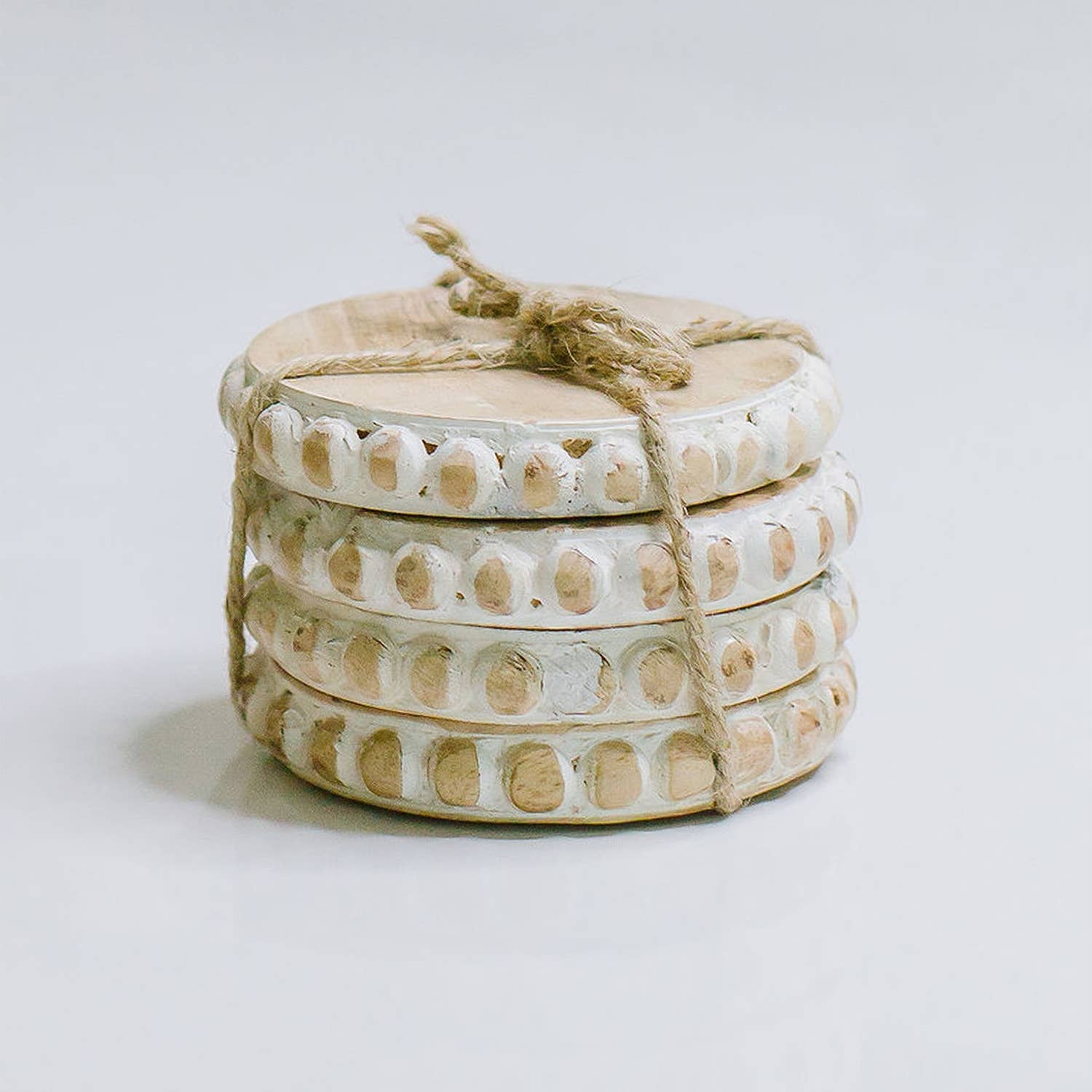 Meet the Rustic Collection. Our Beaded Wood Coasters are simplistic with one of of a kind beaded edges and wood that will compliment any coffee table. Set of 4 coasters, Hand wash only, Food safe wood