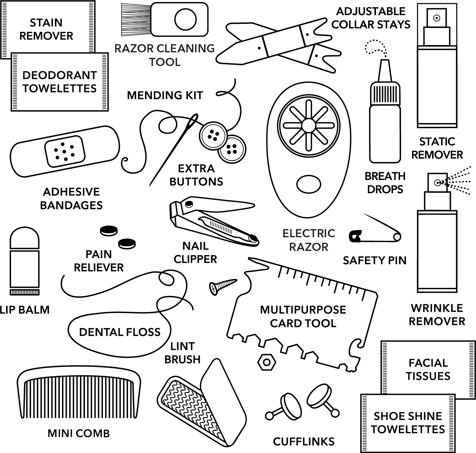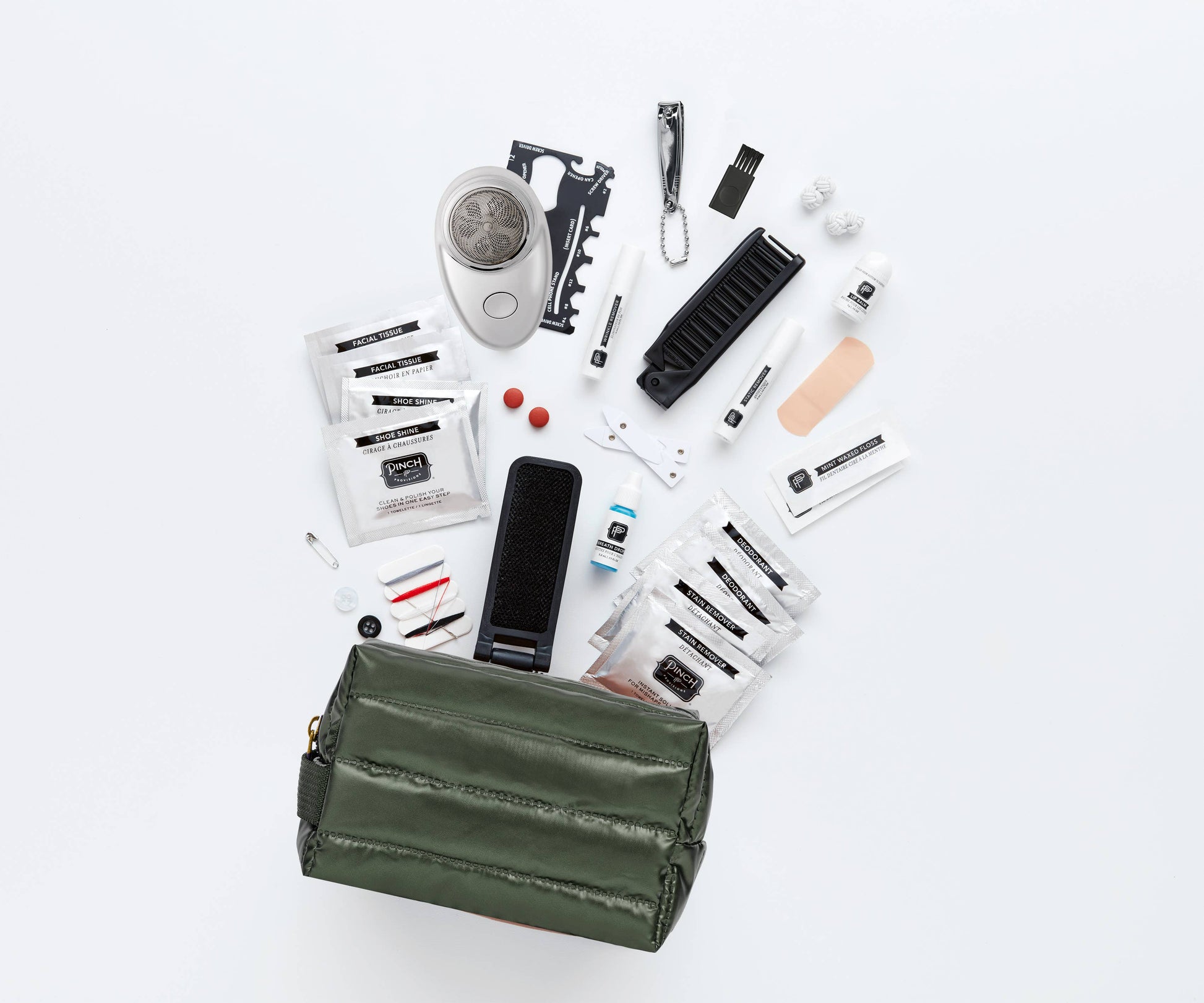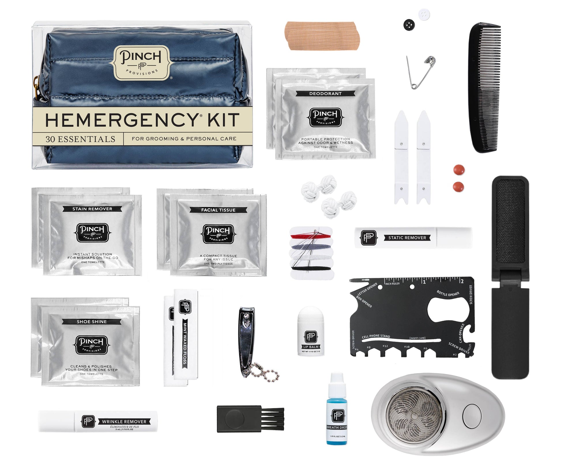 Don't get in a huff. When life has you saying "what the puff," the Puffer Hemergency Kit from Pinch Provisions will save the day! This 30-piece emergency kit includes (2) stain remover towelettes, (2) deodorant towelettes, electric razor with cleaning tool, (2) collar stays, static remover, breath drops, (2) adhesive bandages, mending kit, safety pin, lip balm, pain reliever, extra buttons, nail clipper, wrinkle remover, (2) dental floss, multipurpose card tool, mini comb, lint brush, (2) cufflinks, (2) facial tissues and (2) shoe shine towelettes. This kit is perfect for desk, travel, or anywhere in between.